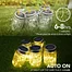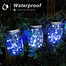 These Mason jar lights can be presented in many ways. You can hang them on places where can get the sunlight during the daytime, or just let the lights sit on the ground or table as a mood lamp.